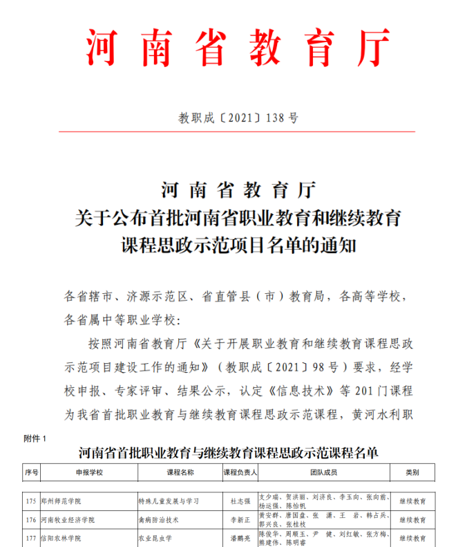近日,教育厅公布了首批河南省职业教育和继续教育课程思政示范项目建设名单(教职成[2021]98号),beat365官网李新正老师主讲的《禽病防治技术》课程名列其中,也是beat365官网唯一入选河南省职业教育和继续教育课程思政示范课程。