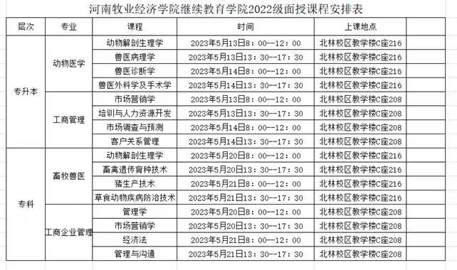 根据各专业总体教学安排和本学期教学进度,我院定于2023513日、14日、20日、21日在北林校区进行2022级四个专业(动物医学、工商管理、畜牧兽医、工商企业管理)的课程面授,面授内容主要侧重以下方面: